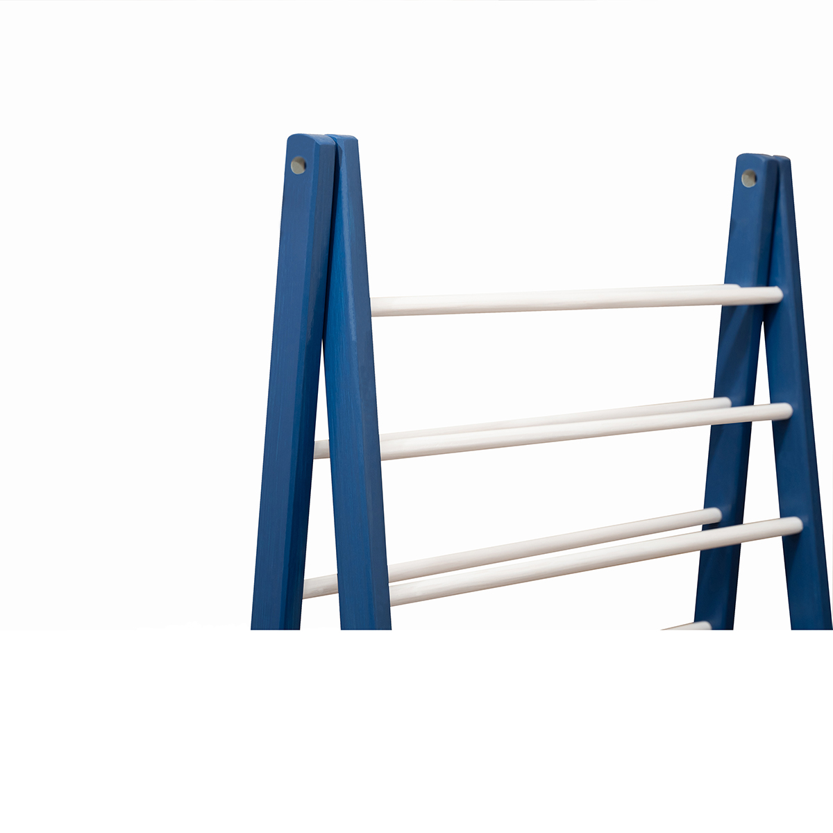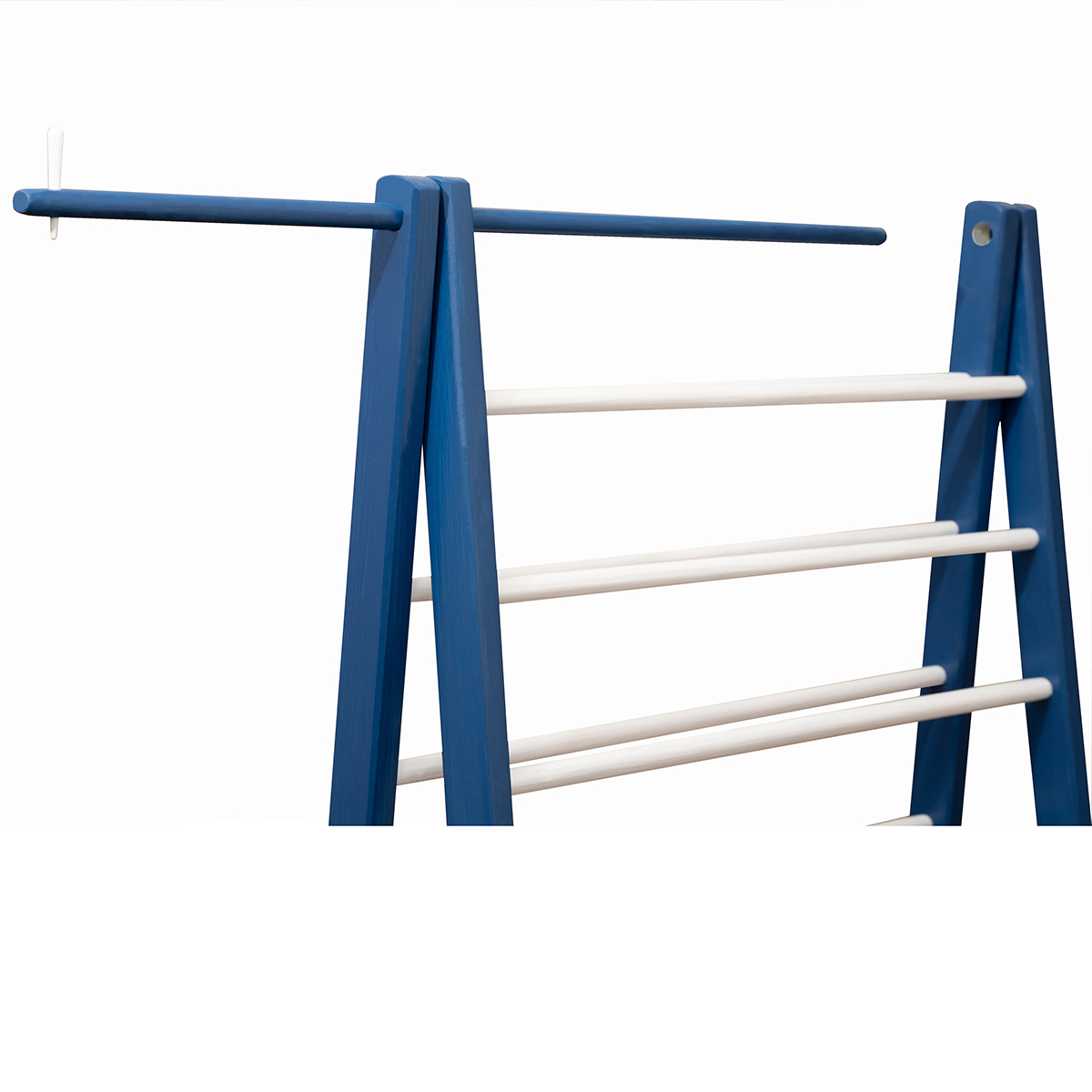 - In the “mounted” position, the clothes airer has, in its upper part, two wooden wedges, which block the sliding of the upper final bar (blue). To dismantle it, for storage, remove the wooden wedge and remove the final bar (blue), by sliding it. (SEE photo 4 and photo 5)
